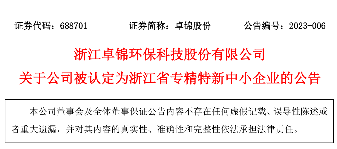 關(guān)于被認定為2022年度專精特新中小企業(yè)的公告