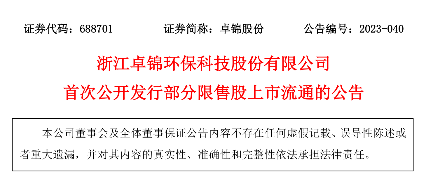 浙江卓錦環(huán)保科技股份有限公司首次公開發(fā)行部分限售股上市流通公告
