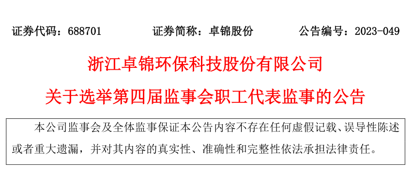 浙江卓錦環保科技股份有限公司關于選舉第四屆監事會職工代表監事的公告