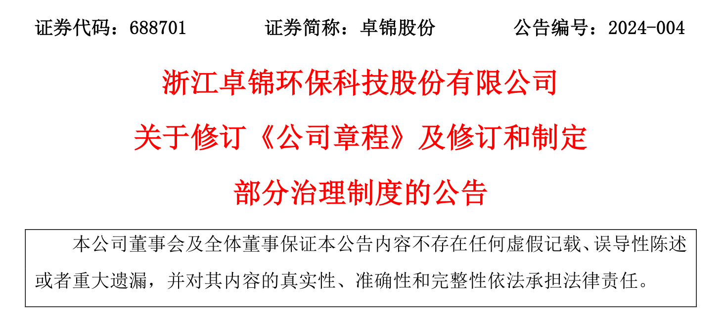 浙江卓錦環保科技股份有限公司關于修訂《公司章程》及修訂、制定部分治理制度的公告