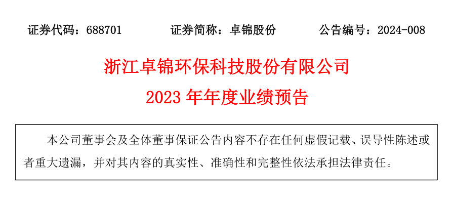 浙江卓錦環保科技股份有限公司2023年年度業績預告