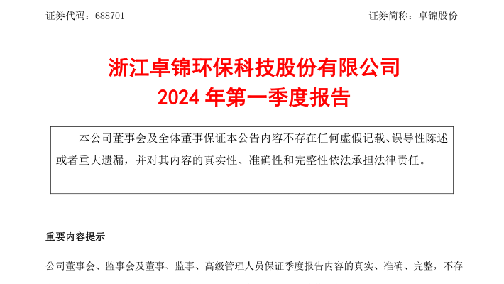浙江卓錦環(huán)保科技股份有限公司2024年第一季度報告