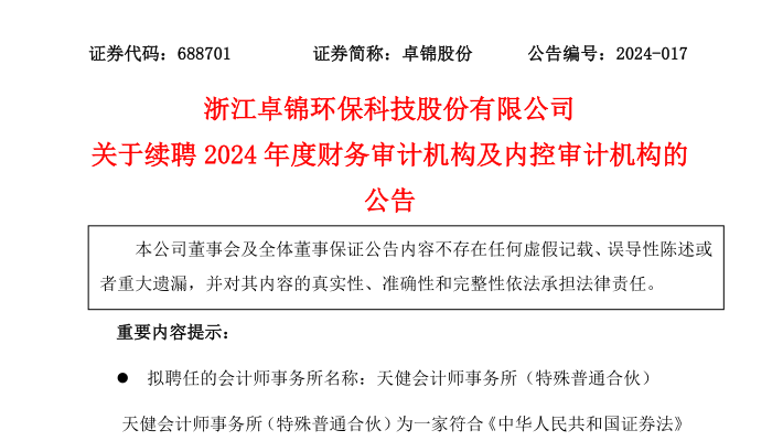 附件:浙江卓錦環(huán)保科技股份有限公司關(guān)于續(xù)聘2024年度財(cái)務(wù)審計(jì)機(jī)構(gòu)及內(nèi)控審計(jì)機(jī)構(gòu)的公告