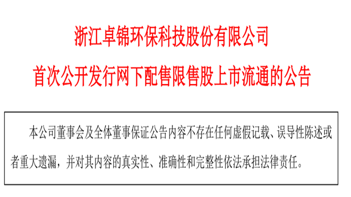 浙江卓錦環保科技股份有限公司首次公開發行網下配售限售股上市流通公告